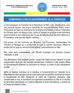 La raison de cette rupture : le porte-parole de l’agence ukrainienne de renseignement militaire, Andriy Yusov, a selon Bamako avoué dans une vidéo « l’implication de Kiev », dans la défaite de l’armée malienne et du groupe paramilitaire russe Wagner fin juillet, lors de combats avec des séparatistes et djihadistes qui ont causé de lourdes pertes.
