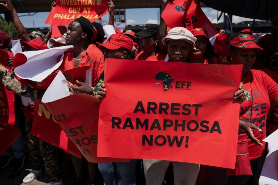 Les Combattants de la liberté économique et l’African Transformation Movement, de gauche, souhaitent que la Cour constitutionnelle annule un vote du Parlement fin 2022 qui a sauvé Ramaphosa des audiences de destitution.